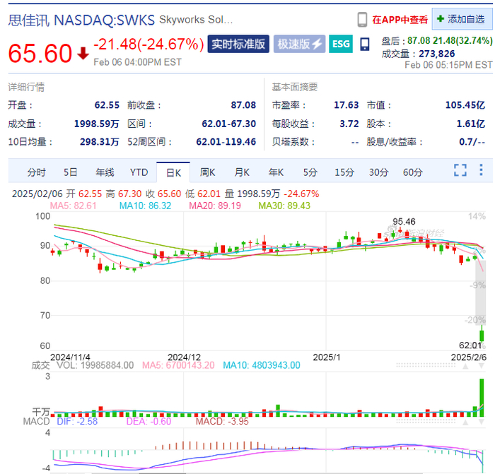 思佳讯收跌近25%,创1987年以来最差单日表现。