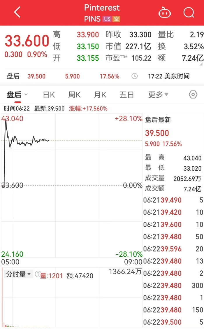 Pinterest美股盘后一度大涨超25%。Pinterest财报显示,2024年四季度营收11.5亿美元,分析师预期11.4亿美元;四季度调整后EBITDA为4.709亿美元,分析师预期4.47亿美元;四季度月活用户数5.53亿,分析师预期5.4742亿;四季度ARPU为2.12美元,分析师预期2.10美元。预计一季度营收8.37亿美元~8.52亿美元,分析师预期8.35亿美元;预计一季度调整后EBITDA为1.55亿美元~1.70亿美元,分析师预期1.415亿美元。