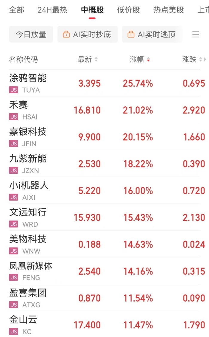涂鸦智能涨25.74%、金山云涨11.47%。