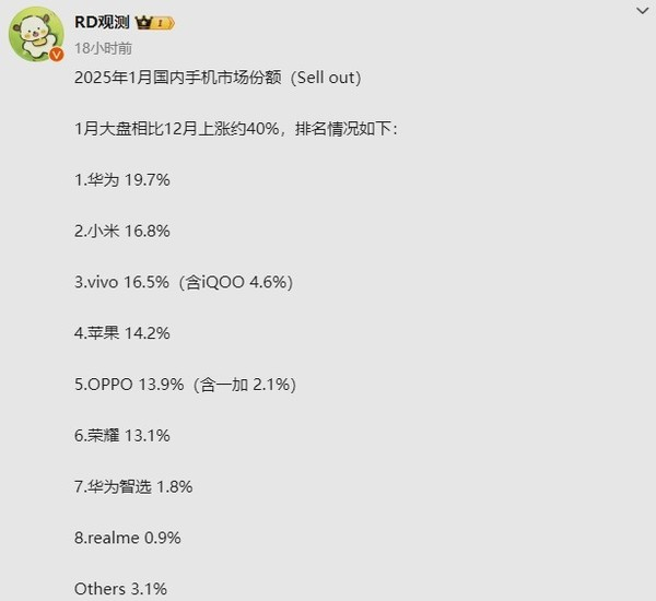 2025年1月国内手机市场份额排名:华为夺冠 苹果第四