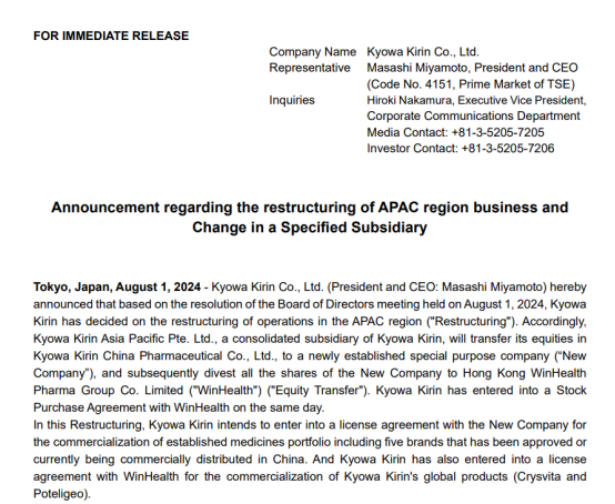 2024年8月,日本协和麒麟株式会社宣布将重组其亚太地区业务以推动增长,以7.2亿元(约1亿美元)的价格将其中国业务售给香港维健医药集团。次月,香港维健医药正式宣布,已成功完成对协和麒麟(中国)制药有限公司股权收购的交割。