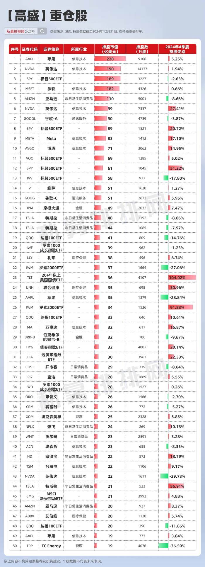 SEC资料显示,截至2024年底,高盛共有6458只美股持仓,持股市值合计6343亿美元,其在4季度对特斯拉、罗素2000ETF、20+年以上美国国债ETF分别增持了56%、91%、104%。