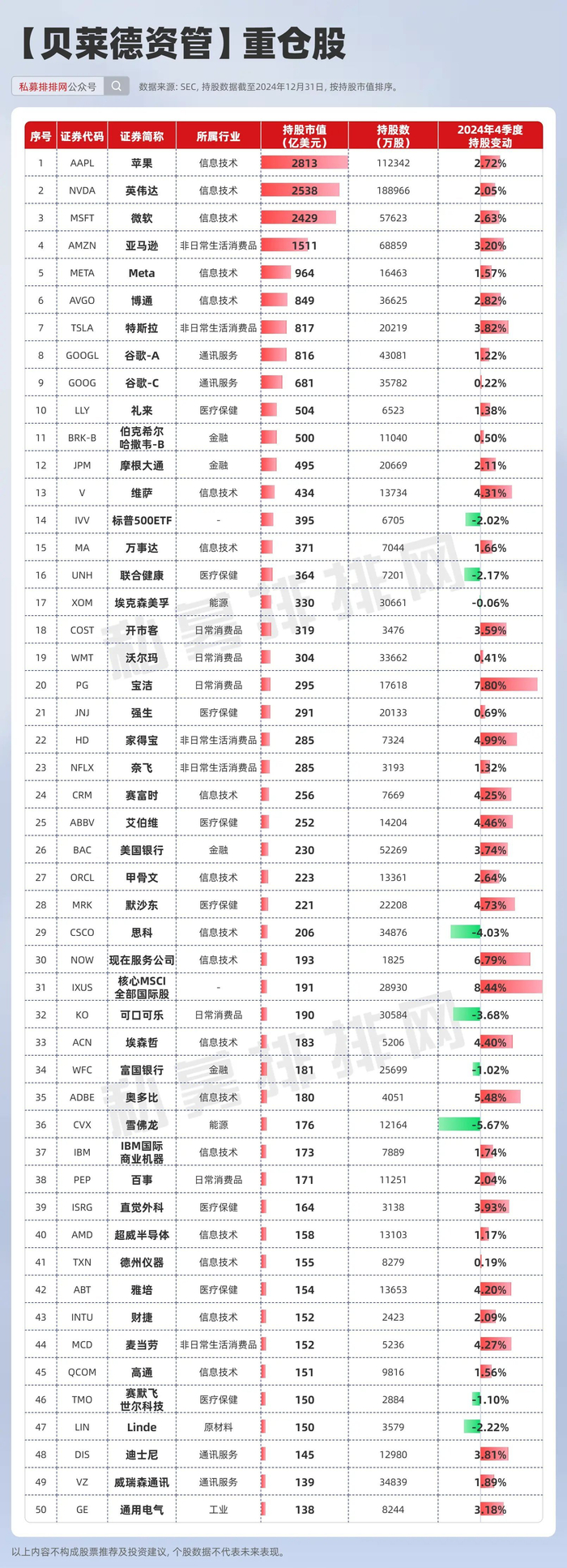 13F文件显示,截至2024年底,贝莱德共有5617只美股持仓,持股市值合计49419万亿美元,该资管公司在4季度对苹果、英伟达、微软等“七巨头”的仓位均有增持,同时增持了8%的标普500ETF,减持了4%的可口可乐。