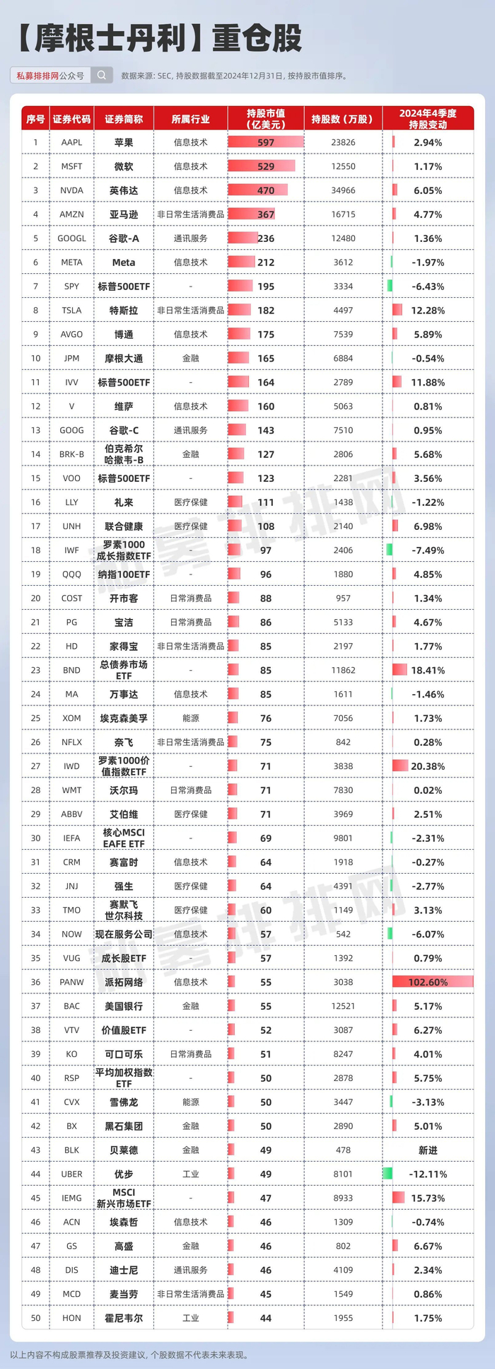SEC资料显示,截至2024年底,摩根士丹利共有8392只美股持仓,持股市值合计14275亿美元,前10大持仓分别为“七巨头”、标普500ETF、博通、摩根大通。