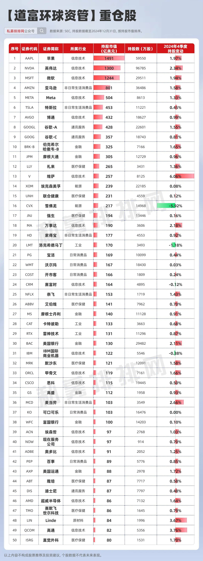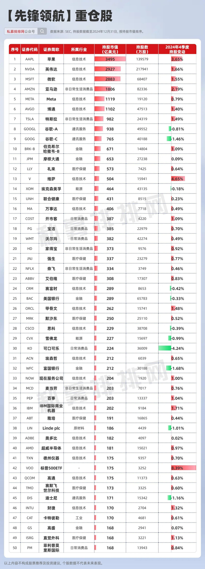 SEC资料显示,截至2024年底,先锋领航共持有4437只美股,持股市值合计57412亿美元,前十大持仓为“七巨头”、博通、伯克希尔哈撒韦,除谷歌外均在4季度获得了增持。