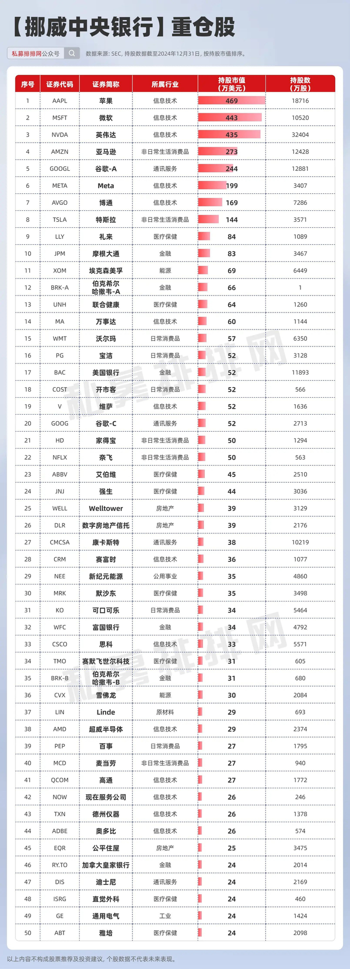 SEC资料显示,截至2024年底,挪威中央银行共有1847只美股持仓,持股市值合计7620亿美元。前十大持仓分别为“七巨头”、利来、摩根大通、博通。