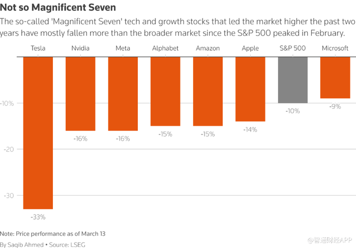 自标普500指数2月19日见顶以来,“七巨头”股票平均下跌了约17%,其中特斯拉(TSLA.US)下跌了约33%。