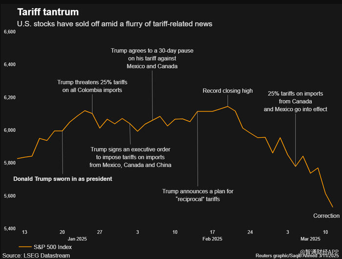 此次下跌导致标普500指数的市值从2月份的高点蒸发了约5万亿美元,标志着市场情绪与年初相比急剧转变,当时华尔街基本上为特朗普的大部分议程欢呼。该指数上一次出现回调是在2023年底。