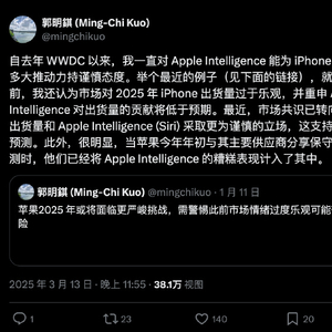 苹果分析师郭明錤于3月14日再度发表分析报告,指出苹果在iOS 18中引入的Apple Intelligence(苹果智能)功能未能有效刺激用户升级iPhone的意愿,导致iPhone 16及后续机型的出货量面临压力。