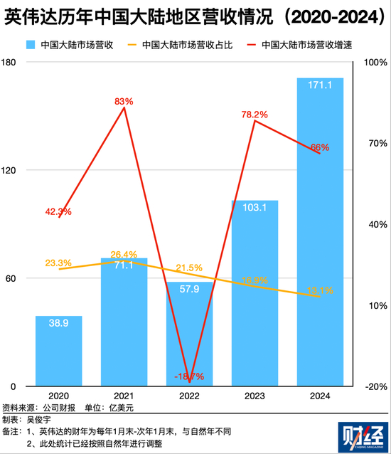 英伟达2025财年(约为2024年,英伟达的财年为每年1月末-次年1月末)报告显示,它在中国大陆(英伟达财报中的中国大陆市场含中国香港地区)收入171亿美元,同比增长66%。中国大陆地区在英伟达营收大盘中的占比为13.1%。美国出口管制导致英伟达中国大陆地区收入占比已连续三年下滑。