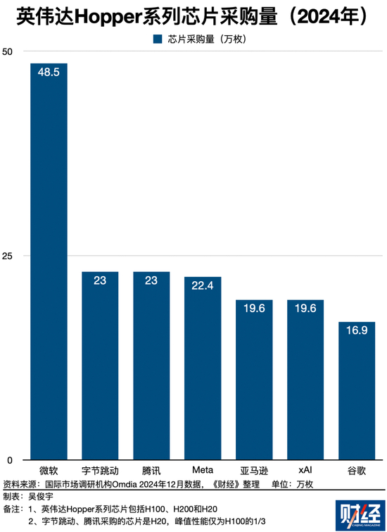 国际市场调研机构Omdia 2024年末报告显示,2024年英伟达Hopper(包括H100、H200,以及特供中国市场的H20)系列芯片全球最大买家分别是微软(48.5万枚)、字节跳动(23万枚)、腾讯(23万枚)、Meta(22.4万枚)、亚马逊(19.6万枚)、xAI(19.6万枚)、谷歌(16.9万枚)。