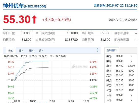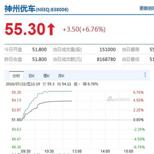 新浪财经讯 “专车第一股”神州优车今日正式挂牌新三板,开盘价报51.8元,涨0.39%,成交近200万。开盘后,股价直线攀升,仅8分钟市值即突破400亿,截至发稿,神州优车报价55.30元,大涨6.76%,成交额超800万,市值已近420亿元。