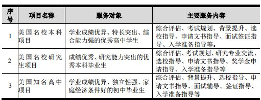 就商业模式来看,留学咨询业务主要由美国名校本科、美国名校研究生和美国知名(私立寄宿制)高中三大类构成,形成了以美国知名大学的本科、研究生为主,美国知名高中为辅的业务格局。
