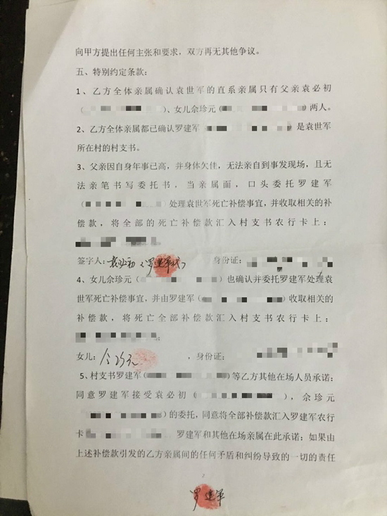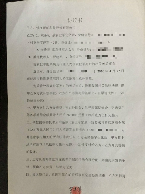 此外,在媒体得到的一份《协议书》中,镇江蓝舶作为甲方,与死者袁某某家属(父亲、女儿及委托代理人)签订了一份赔偿协议。根据协议,“甲方赔偿乙方丧葬费、死亡补助金、供养亲属抚恤金、交通费用等各项补偿金额共计人民币925000元整”。
