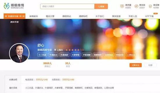 挖贝网在上海维情的公司官网上发现,公司的维情首席专家舒心(兼任上海维情的董事长、总经理)的电话咨询、当面咨询收费为3000元/小时,相当于50元/分钟。而级别最低的“维情资深专家”,资费也是1000元/小时。