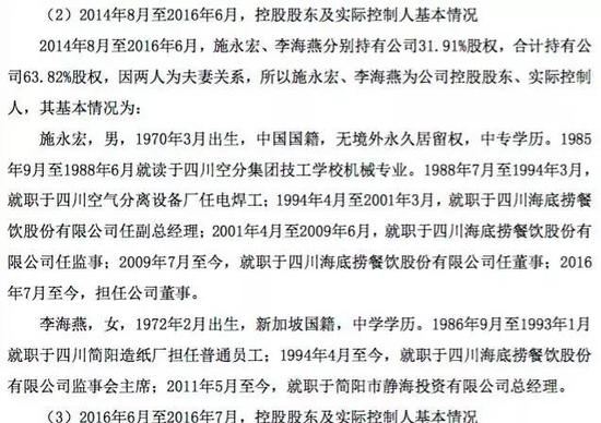 施永宏、李海燕是海底捞创始人之一。股转书显示,施永宏1994年4月至2001年3月,就职于四川海底捞任副总经理;2001年4月至2009年6月,就职于四川海底捞任监事;2009年7月至今,就职于四川海底捞任董事。李海燕则从1994年4月至今,就职于四川海底捞监事会主席。