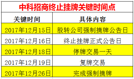 2017年12月18日(周一),中科招商将停牌交易1天,12月19日(周二)将复牌交易,复牌期间挂牌公司与主办券商应当持续披露终止挂牌风险(至少三次)。