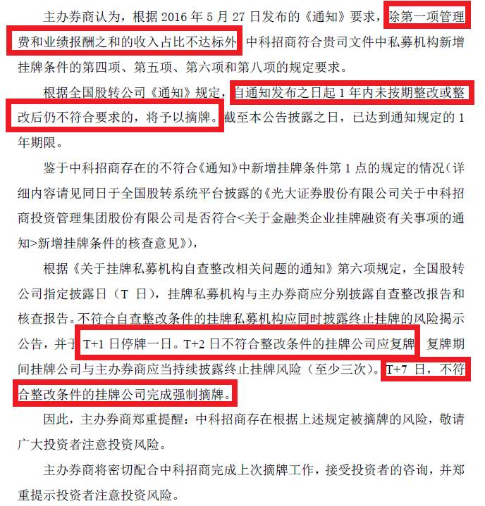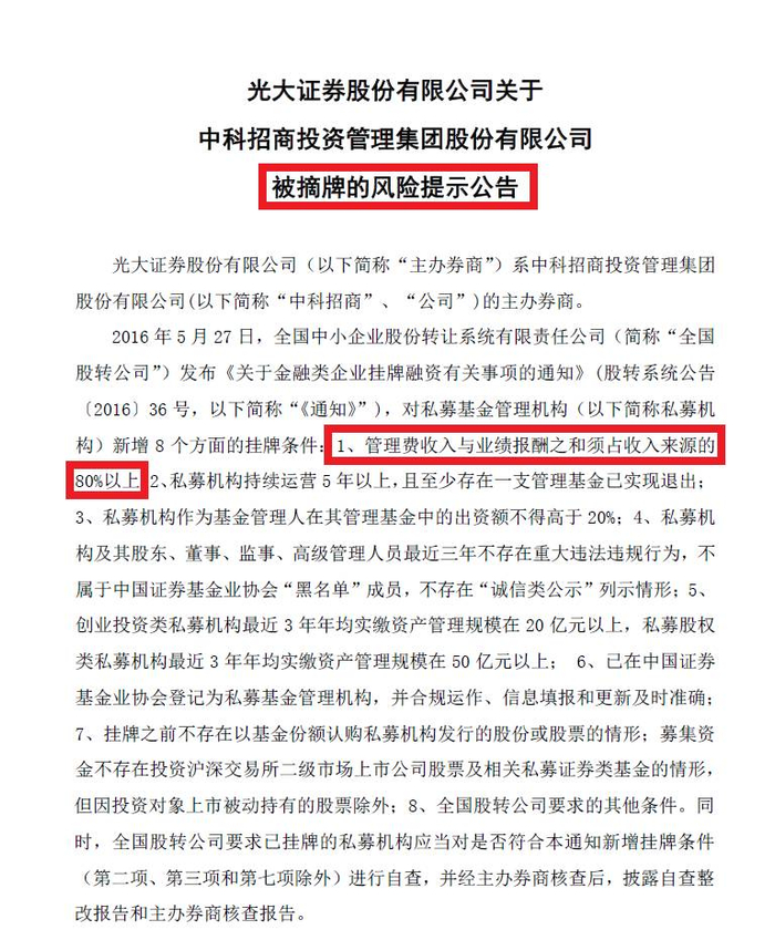 随后中科招商发布被摘牌的风险提示公告,公告列举了2016年5月全国中小企业股份转让系统有限责任公司发布《关于金融类企业挂牌融资有关事项的通知》,对私募基金管理机构新增8个方面的挂牌条件。