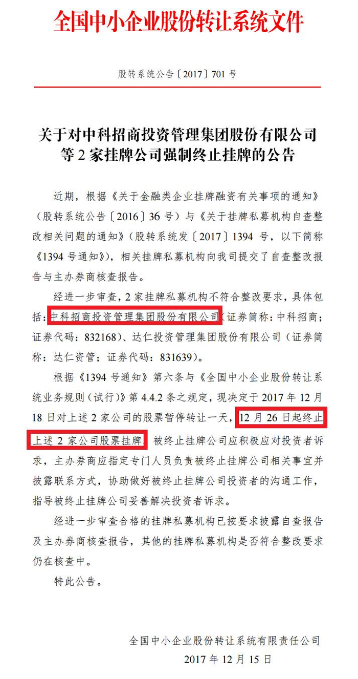 2017年12月26日(周二),不符合整改条件的挂牌公司完成强制摘牌。