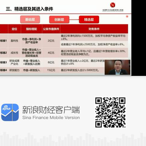 新浪财经讯 新三板重磅改革举措频频落地!近期,新三板市场成交额暴增、公募可投资新三板、开户数持续增加……等消息成为市场热点。随着转板制度正式出炉,备考新三板精选层企业热度不断升温,市场目光聚焦到了精选层企业的筛选及定价发行上。为了帮助企业及投资者更好理解相关改革政策,新浪财经将邀请股转公司相关负责人、投行人士、新三板公司代表等共议新三板深化改革的重点,精选层如何筛选公司、与科创板信披、定价的相似度与差异度等。