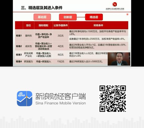 本次深化改革之后,新三板从静态地来看,将形成一个三层次的市场结构,也就是基础层、创新层、精选层。每一个层次,我们对企业进入该层次的条件有不同的要求。不管是在财务状况还是较高地公告水平,从基础层到精选层都有逐步加强的过程,而相应的匹配的差异化的制度安排主要是在投资者门槛、交易方式、发行融资的方式等等方面也是从基础层到创新层融资交易的功能是有一个逐步的增强。