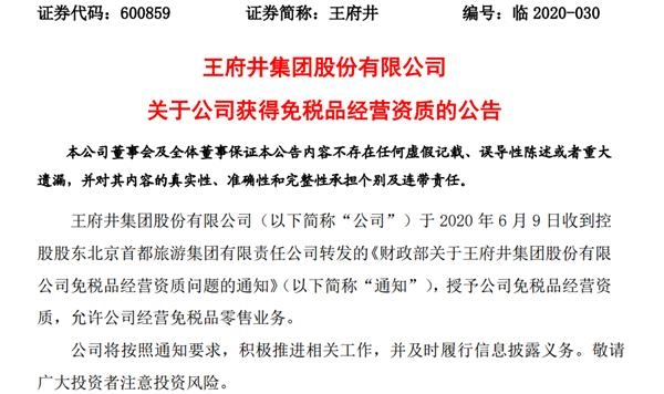 在当晚的异动公告中,王府井便就监管问询时间予以澄清。王府井表示,公司关注到近日部分新闻媒体报道公司取得免税牌照事宜,公司已按照法律法规要求,第一时间披露了《关于公司获得免税品经营资质的公告》。