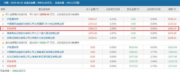交易所6月2日公布的龙虎榜显示,当日买入、外出首席均为沪股通专用席位,买入5594.37万元,卖出8829.44万元。