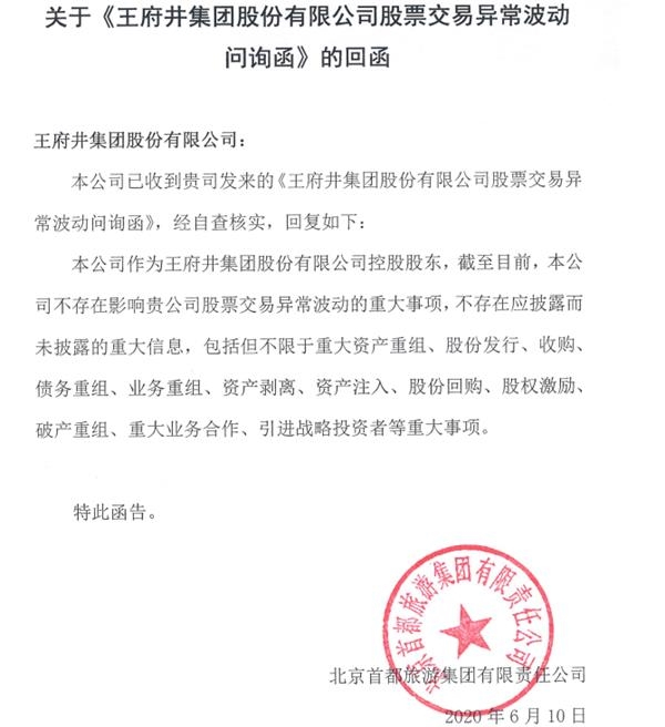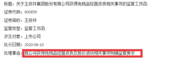 6月10日,王府井两连板后,上交所向王府井发出监管工作函,就公司获得免税品经营资质及股价波动相关事项明确监管要求。