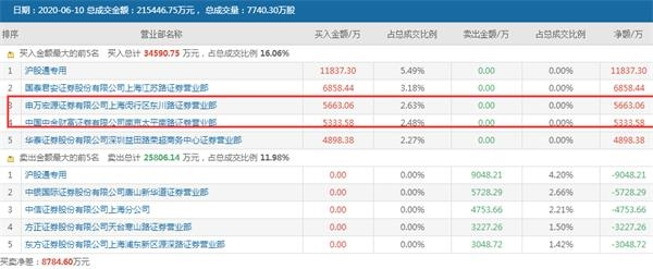 6月10日,盘后公布的龙虎榜显示,买入榜前五的席位当天合计成交了约3.46亿元,占到当天成交总额的约30%。沪股通专用既是买入第一名,也是卖出最多的席位,买入金额比卖出金额多2789万元。