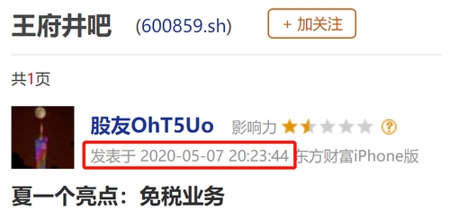 王府井的这轮大涨行情,是从4月底5月初启动的。五一前的两个交易日,已经被跌了两年多的王府井默默上涨5%。5月7日,王府井大涨5.3%。当晚便有人在股吧发帖,“下一个亮点,免税业务”。