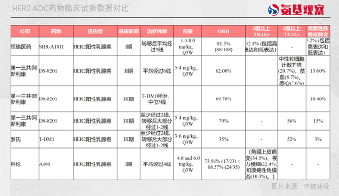 仍以DS-8201来说,虽然此前其间质性肺炎发生率高达15%,但在最近的 DESTINY-Breast03 临床试验中,间质性肺炎的发生率降低到了5%,也并未观察到 4/5 级判定为和DS-8201相关的间质性肺炎事件。如果拿这一数据来对比,SHR-A1811的安全性优势并不算明显。