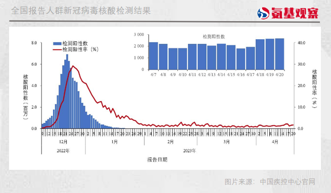 根据中国疾控中心数据,2022年12月9日以来,各省份报告人群新冠阳性数及阳性率呈现先增加后降低趋势,阳性人数12月22日达到高峰后波动下降,2023年4月20日降至2661例。