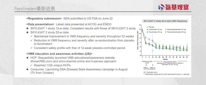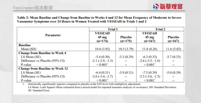 在SKYLIGHT 1和SKYLIGHT 2试验中,为1022名40至65岁患有中度至重度血管舒缩症状的女性每日口服一次Veozah® (30mg和45mg)的疗效和安全性,同时进行安慰剂组对照。通过两项试验的结果可以发现,与安慰剂相比,服用45mg Veozah®的中度至重度血管舒缩症状的频率和严重程度,从基线到第4周和第12周在统计学上均实现了显著性的降低,两项临床中分别减少2.6次和2.5次。与传统HRT相比,fezolinetant作用起效更加迅速,并能持续数周。