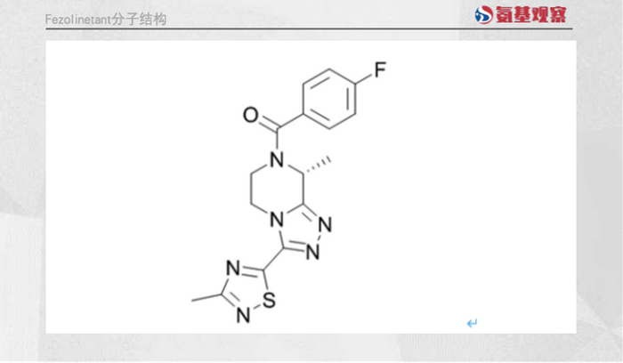 Fezolinetant是一款口服、选择性神经激肽3(NK3)受体拮抗剂,通过阻断神经激肽3(NK3)与Kisspeptin/神经激肽/强啡肽(KNDy)神经元的结合,调节大脑体温调节中枢(下丘脑)的神经元活动,以降低绝经相关中重度VMS的频率和严重程度。