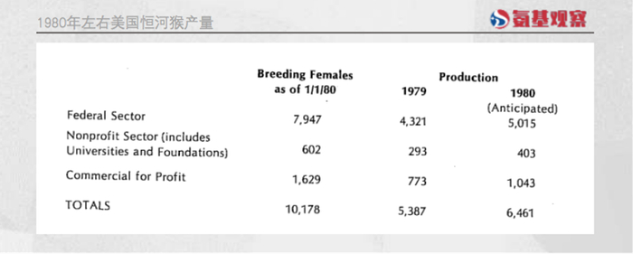 不过,NPRC的出现,并没有彻底解决美国猴子的紧缺问题。如下图所示,1980年左右,NPRC中心只能提供大约20%—30%左右的恒河猴产能。这一现状,一直维持到今天。