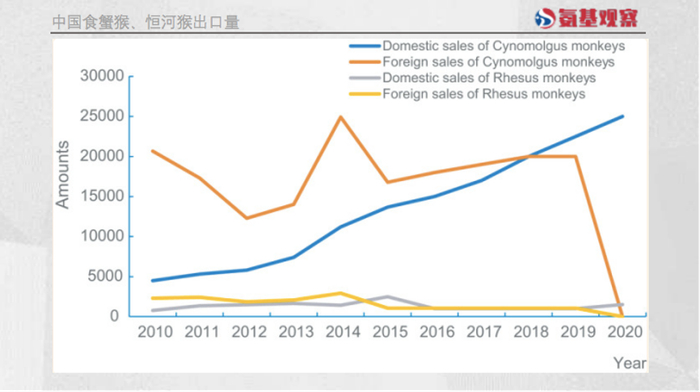 如下图所示,疫情之前,不管是恒河猴还是食蟹猴,中国的出口数量都是极为惊人的。