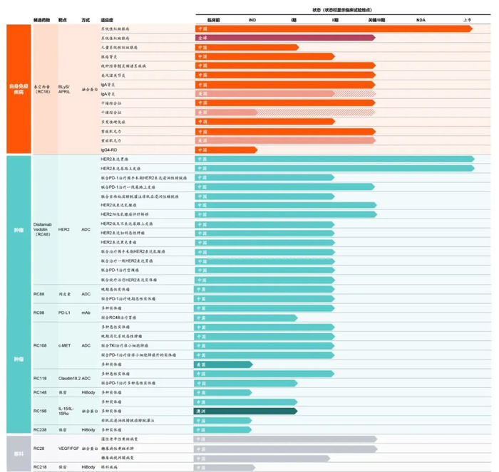 管线储备上,荣昌生物开发了20余款候选生物药产品,包括以RC18为代表的自免药物,以RC48、RC88、RC118等为代表的抗肿瘤药物,以及RC28、RC218等眼科药物,覆盖PD-L1、ADC和融合蛋白等多种药物类型,ADC管线占比超50%。