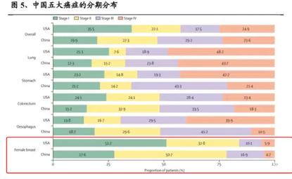 一方面,其针对的患者群体规模将会显著增加。所谓新辅助治疗,是指在手术切除肿瘤前,先使用化疗、放疗、靶向治疗等方法对患者进行治疗,目标群体主要是2/3期肿瘤患者。不管是美国还是中国,新确诊的乳腺癌患者中,2/3期肿瘤患者比例最高。