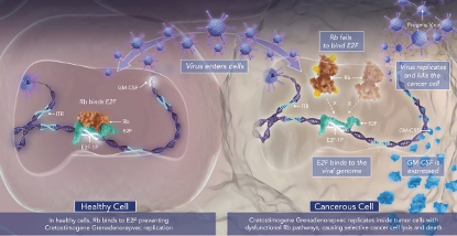 一方面,Cretostimogene插入E2F-1启动子,能够选择性裂解Rb调控缺陷的肿瘤细胞,而不是具有完整Rb通路的健康细胞;