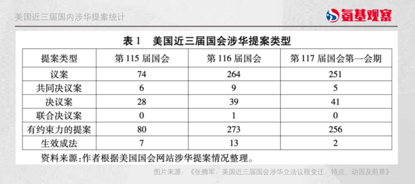 如下图所示,学者张腾军统计发现,在第117届国会第一会期,共有251项涉华提案,但只有2项成为法律,通过率不到1%;第116届国会这一比率为5%。