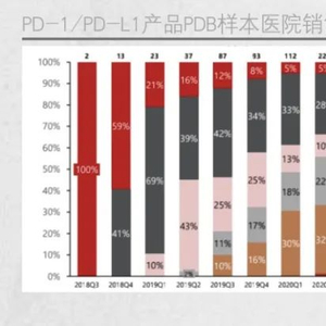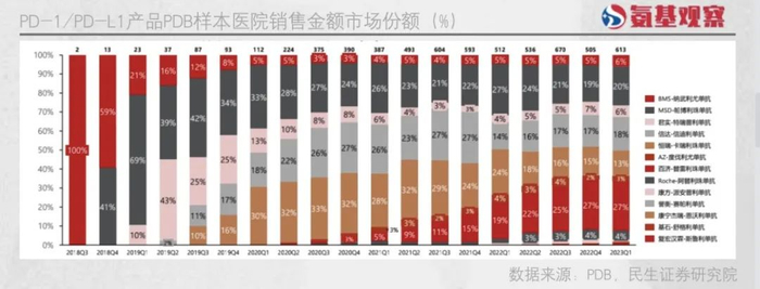 只是,优势并没有保持太长时间。此后,O药便被K药超越。随着国产PD-1的逐步上市,O药的处境更加艰难。如下图所示,在医院中其市场份额一度下滑至3%。
