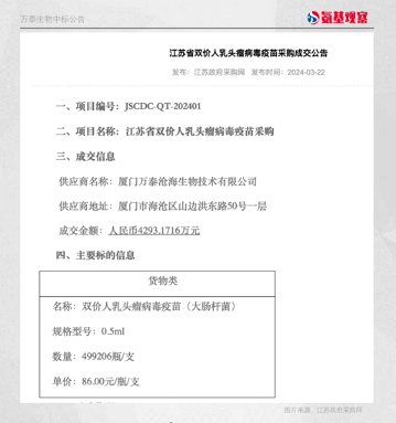 根据江苏政府采购网发布的二价HPV疫苗采购成交公告,万泰生物凭借86元/支的价格,成功中标499206支2价HPV疫苗的采购项目。