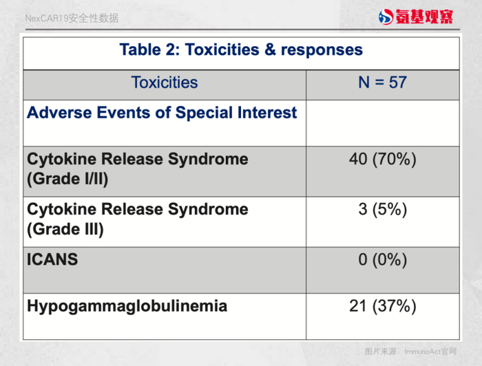 安全性方面,NexCAR19因ICANS的缺失、细胞减少的持续时间较短以及3/4级CRS的发生率较低。