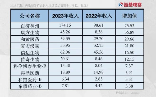 以绝对值来看,整个行业的营收增量主要来自百济神州、康方生物等药企。其中,百济神州2023年营收增长达到75亿元,康方生物营收增长接近37亿元。