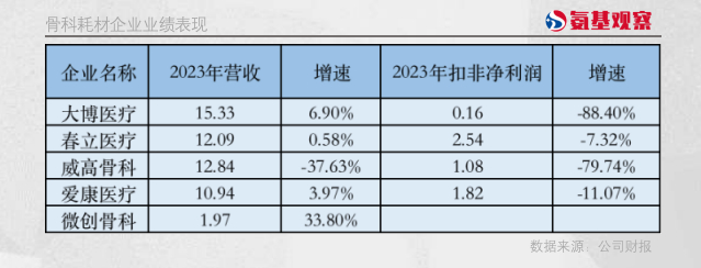 2023年的财报数据显示,国内骨科巨头的普遍出现了增收不增利的情况。这表明即使巨头在适应市场新环境的同时,也面临着严峻的盈利考验。