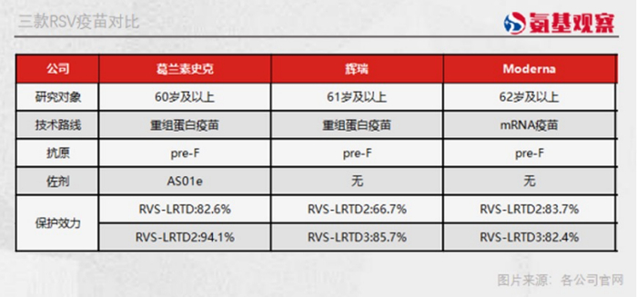 虽然辉瑞、Moderna、葛兰素史克疫苗的三款RSV疫苗未进行头对头试验,但如果以预防2种或更多RSV相关下呼吸道症状(RVS-LRTD2)的有效率作为统一临床终点,辉瑞、Moderna、葛兰素史克疫苗保护率分别为66.7%、83.7%、94.1%。