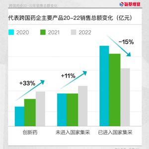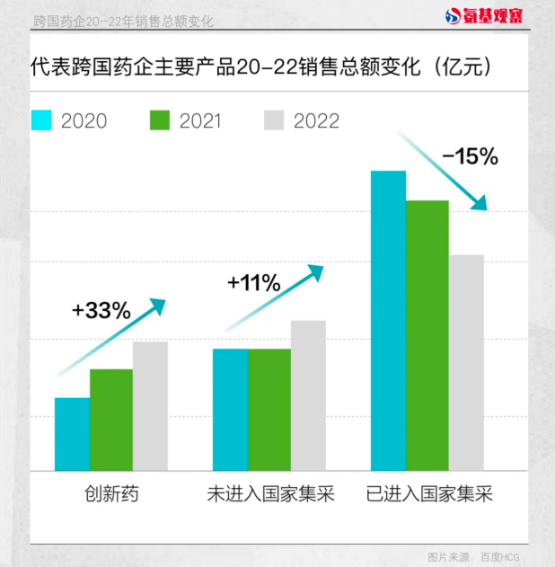 整体来看,在医保控费力度不断加大的背景下,2020-2022三年间,跨国药企的整体销售额较为平稳,年均增长1%。