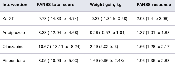 根据荟萃分析来看,对比现有治疗药物,KarXT呈现疗效显著、不良反应减轻的特点。如下图所示,KarXT对比与Aripiprazole(阿立哌唑)、Risperidone(利培酮)效果处于领先地位,并且接受该药物治疗的患者体重得到了有效的控制,没有出现明显“增肥”的效果。