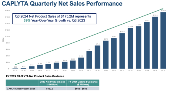 在这两大适应症的支撑下,Caplyta已经展现出了不菲的商业化潜力。2023年,其销售额已经达到4.62亿美元,同比增长86%;2024年继续增长,前三季度销售额达到4.82亿美元,预计全年最高可达6.85亿美元。