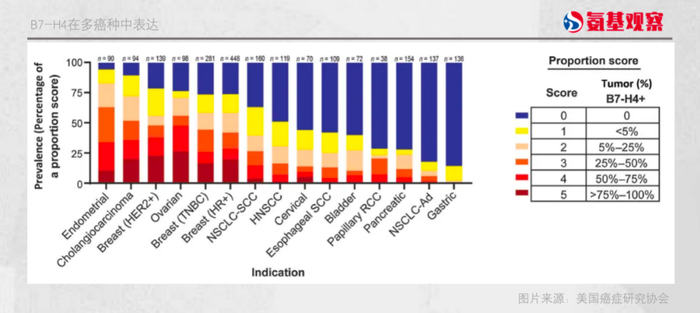 研究证实,B7H4在正常组织中表达有限,但在多种肿瘤中过表达,三阴乳腺癌(TNBC,74%)、卵巢癌(OVC,77%)、子宫内膜癌(EC,94%)以及胆管上皮癌(CCA,89%)。